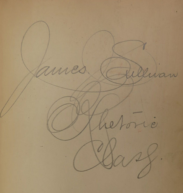The text in the photograph, from The Elementary Treatise on Natural Philosophy, reads “James Sullivan – Rhetoric Class.” Who’s James Sullivan you ask? Well, our project supervisor Dr. Roberts did a little detective work searching through the St. Ignatius College course catalogue and found out that a “James Sullivan” did indeed take a Rhetoric class at St. Ignatius College from 1876-1877. Interestingly, this is the only instance Mr. Sullivan is mentioned in the course catalogue at St. Ignatius College. Thus, he must not have been particular fond of college, nor his Rhetoric books which he left behind! (Click here to view all the photographs from this book)