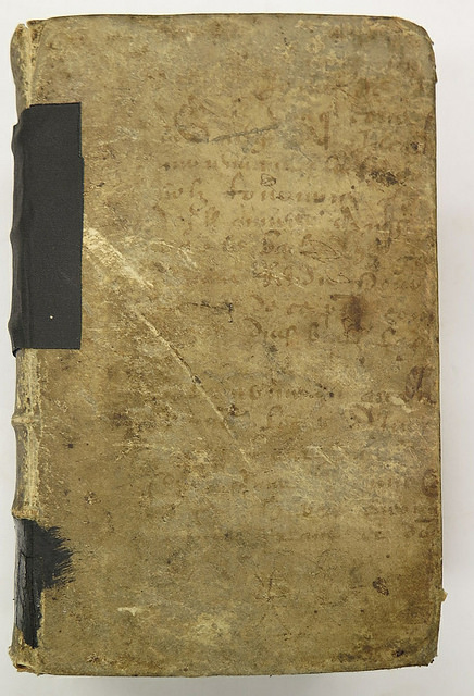 A scholar who visited our Flickr site was able to identify this as a durable parchment, possibly vellum or animal skin. What’s more, the cursive markings seem to indicate that what we have here is a Gothic Latin manuscript cover from the 13th to 15th century!