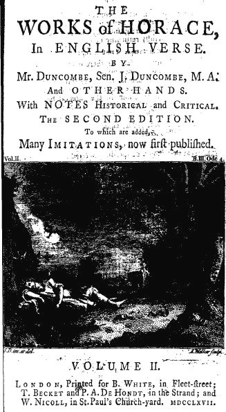 Duncombe’s first recorded translation of Horace dates back to 1715, but it was not until 1757 that he began releasing his most comprehensive English collection. The 1767 publication in our possession is a second edition of this vernacular compilation. The publishing information reveals that Duncombe did not undertake this update alone. He called upon the assistance of his only son, John Duncombe, a notable British author in his own right.