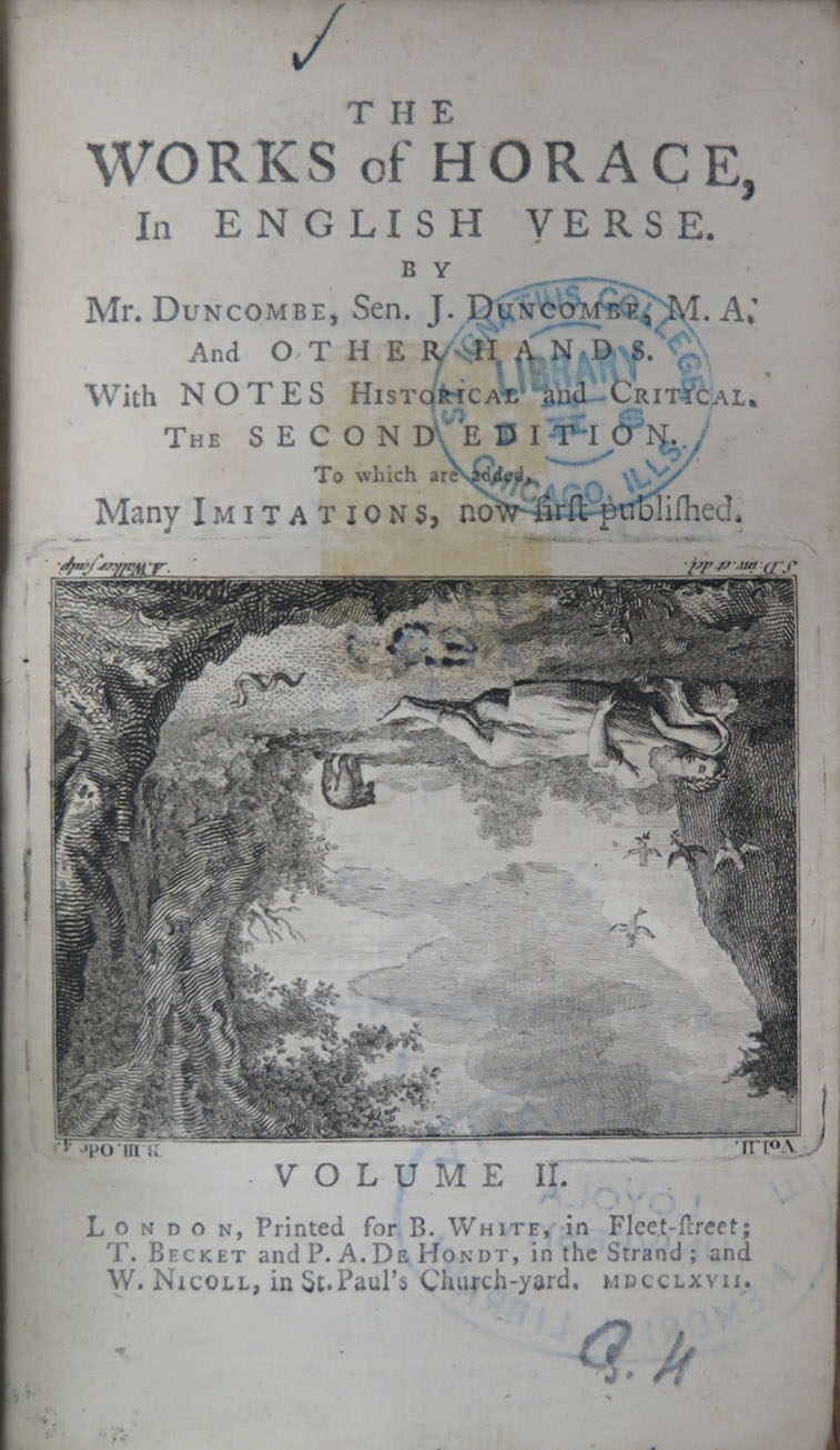Classicists are most assuredly familiar with Quintus Horatius Flaccus, the Roman lyric poet known to anglophones as Horace. His ancient works were frequently translated into English throughout the eighteenth century, and several poetical and prose interpretations found new homes in the nineteenth-century library at St. Ignatius College. Samuel Johnson celebrated the transliterating prowess of Rev. Philip Francis in particular as the finest of his generation. He said succinctly, “The lyrical part of Horace never can be perfectly translated;…Francis has done it the best.” Chicago’s Jesuit educators must have concurred to some degree. In the coming week, we will be featuring not one, but two editions of Francis’s work noted in Loyola University Chicago’s first library catalogue. The subject of the present posting, though, is a blank verse version of Horace by William Duncombe.