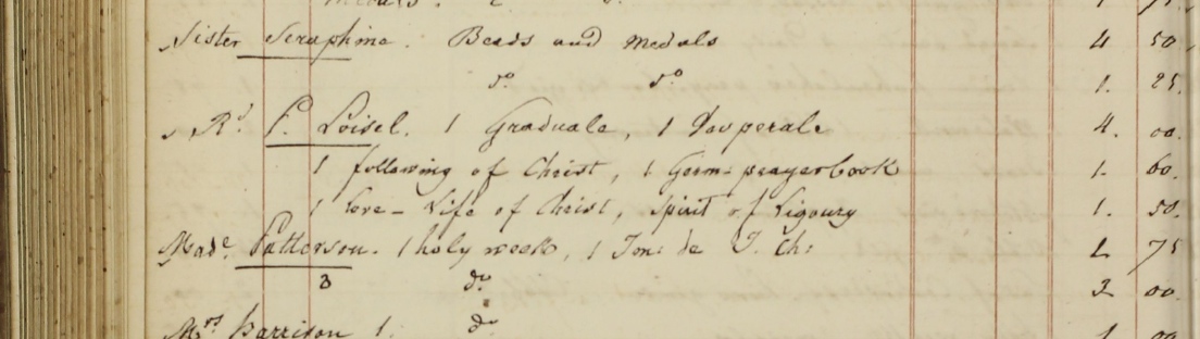 As a history and finance major it seems appropriate that the first document I’ve been looking at this semester is a ledger from the Jesuits’ Missouri Vice Province now in the collections of the Archives of St. Louis University (Missouri did not become a full Province until 1863). For a little context: the volume is catalogued as “Library. Financial Records. 1847-49” in the SLU Archives’ finding aid. It actually documents book trade transactions for much of the 1840s and has separate sections for a “Cash book,” “Ledger,” “Bill book,” “Sales book,” and “Expense book.” The sales section reaches back to April 1842, but I haven’t found a specific reason why.