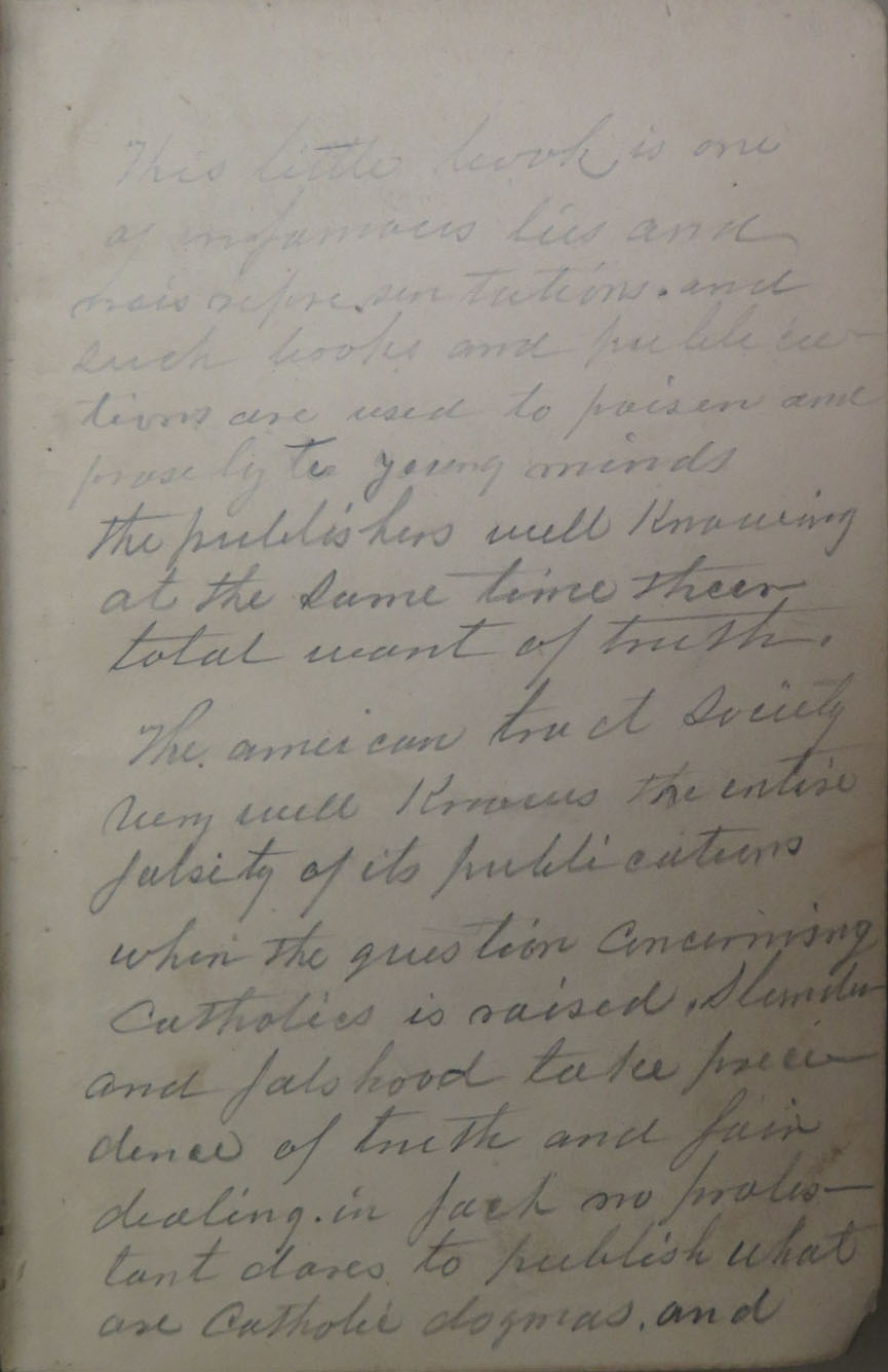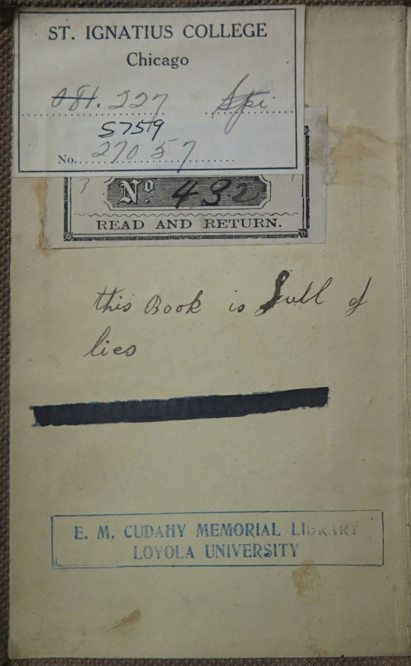 It is fascinating to uncover a work so antagonistic towards Catholics in Chicago’s first Catholic college library. Furthermore, it is not the only book of its kind. There is second book published by the American Tract Society listed in the library catalog called Infidelity. What can we conclude from this? Perhaps Jesuit educators believed that if students were to develop the skills necessary to defend their spiritual identities in a secular world, then they should not be insulated from evangelical criticisms widely available in the American print marketplace.