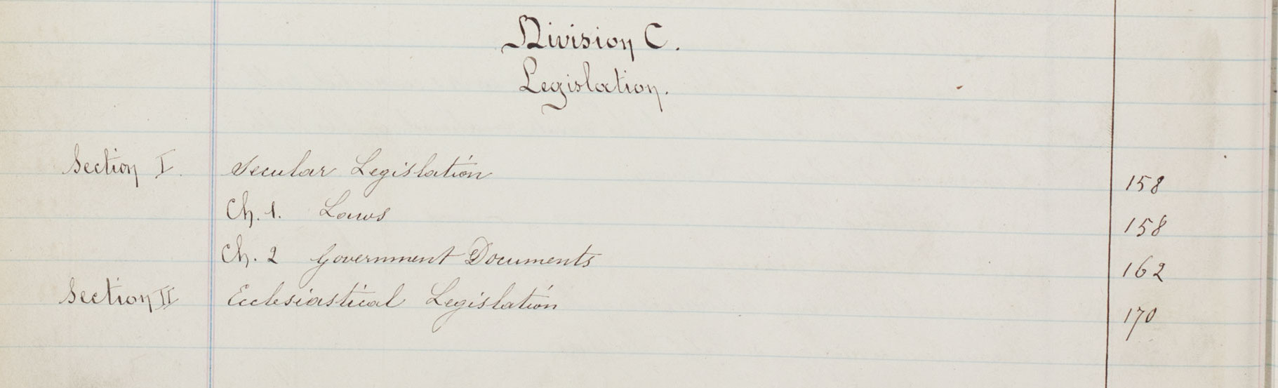 Listing of the Legislation Division from the index of the original St. Ignatius College library catalog.