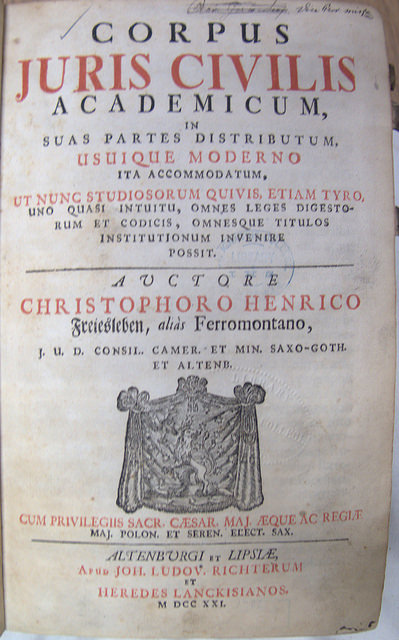Justinian, Corpus Juris Civilis (Altenburg/Liepzig: J.L. Richterum & H. Lanckisianos, 1721)