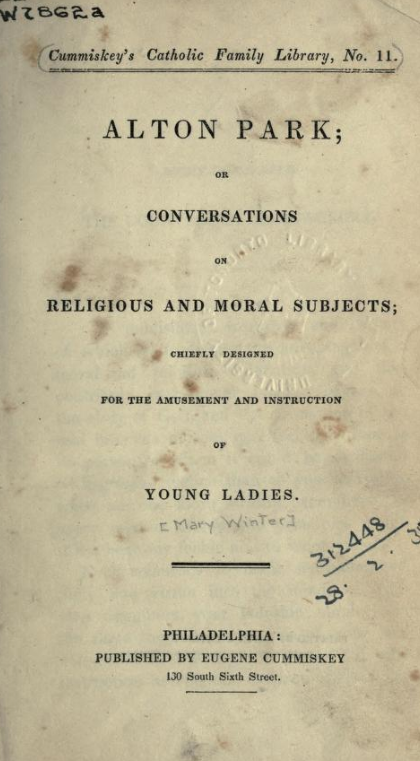 Title page of Alton Park published by Eugene Cummiskey, a frequent wholesaler to the Jesuits (Source: Internet Archive)