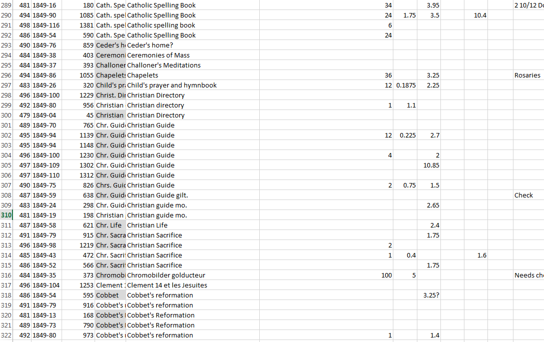 Moving forward with this project, I will be working on understanding the unique titles being sold in 1849 and trying to trace when they were bought by the Jesuits. Using the import data for 1848 and 1849, I should be able to track the origins of books that were sold throughout the Mississippi and Missouri Valleys between May and September of 1849. This step will offer a broader look at the market for Catholic goods and will help show where the books being exported were coming from. This connection is a vital step to understanding the book trade and piecing together this literary world.